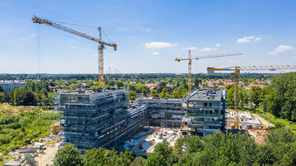 De 3 residentiële gebouwen met 4 tot 7 verdiepingen zijn nog in aanbouw maar de ultramoderne look, naar de hand van Polo architects, is nu al zichtbaar.