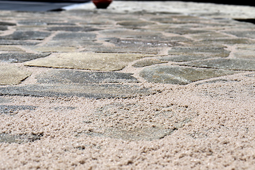 Des pierres naturelles Flagstones aux formes irrégulières ont été jointoyées avec les joints drainants Joint’fill® Drain en couleur beige clair ; pour un bel effet visuel.