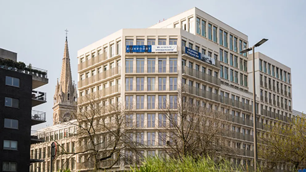 Het bestaande kantoorgebouw op de Rijnpoortvest in Antwerpen werd gerenoveerd en uitgebreid tot project ‘Rijnpoort’ met appartementen, winkel- en kantoorruimte naar de hand van Stramien architecten.