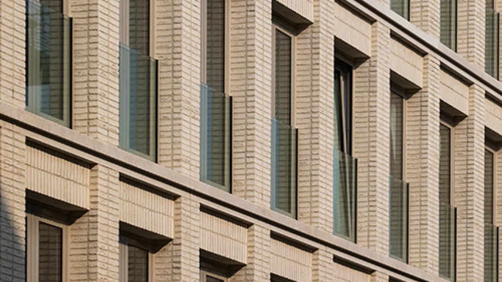Het gedeelte in de Stijfselrui werd uitgevoerd in een gele genuanceerde baksteen ‘South Carolina 1581’ uit de Deppe Backsteincollectie van Heylen Ceramics en beton.