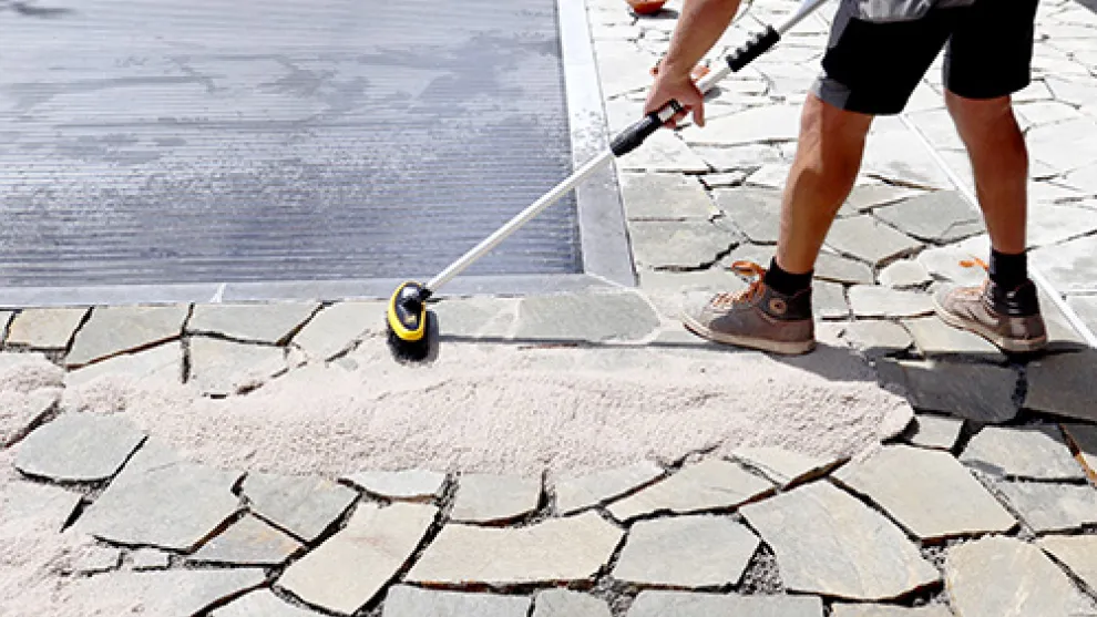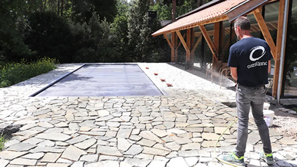 Rondom het zwembad werd door aannemer Eric De Hoef een drainerende opbouw voorzien bestaande uit een stabiele funderingslaag, een drainagemat en een waterdoorlatende dekvloer Chape Drain 15.