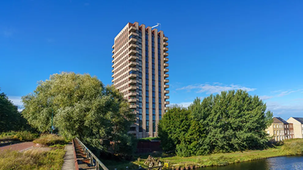 Toren H met een panoramisch uitzicht op de stad Tilburg Toren H vervolledigt het nieuwbouwproject ‘Aan de Waterkant’ in het Nederlandse Tilburg. Naast een diversiteit aan gezinswoningen, is de zestig meter hoge Toren H dé eyecatcher naast het Wilhelminakanaal.
