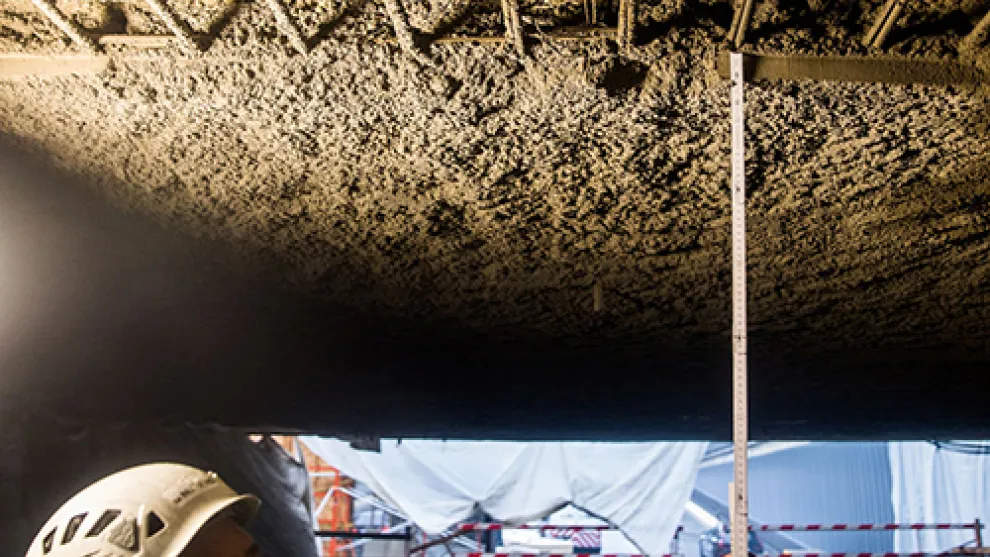 De voorbereiding van de ondergrond en de toegepaste techniek zijn essentieel om een goede hechting te realiseren. “Om een goede hechting mogelijk te maken, wordt het volledige plafondoppervlak eerst gewaterstraald (met hoge druk waterstraal). Vervolgens herstellen we alle zichtbare gebruiken en voegen we een nieuw wapeningsnet toe om het spuitbeton in stroken van 1,15 m breed aan te brengen. Elke stap in het proces wordt door SECO gecontroleerd.”